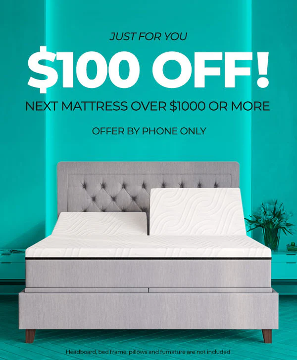 $100 off your next mattress over $1,000 or more - offer by phone only.