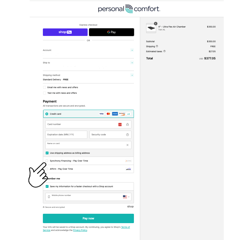 In order to checkout from PersonalComfortBed.Com, you should have easy access to multiple forms of payment including Credit Card, and Pay Over Time Options from Synchrony and Affirm.